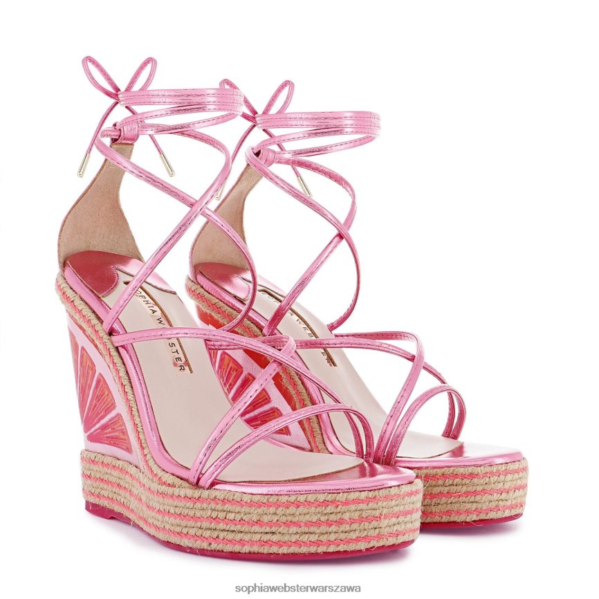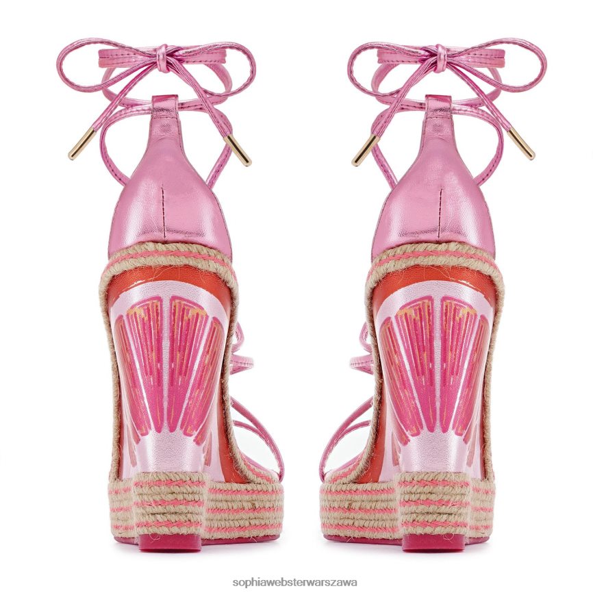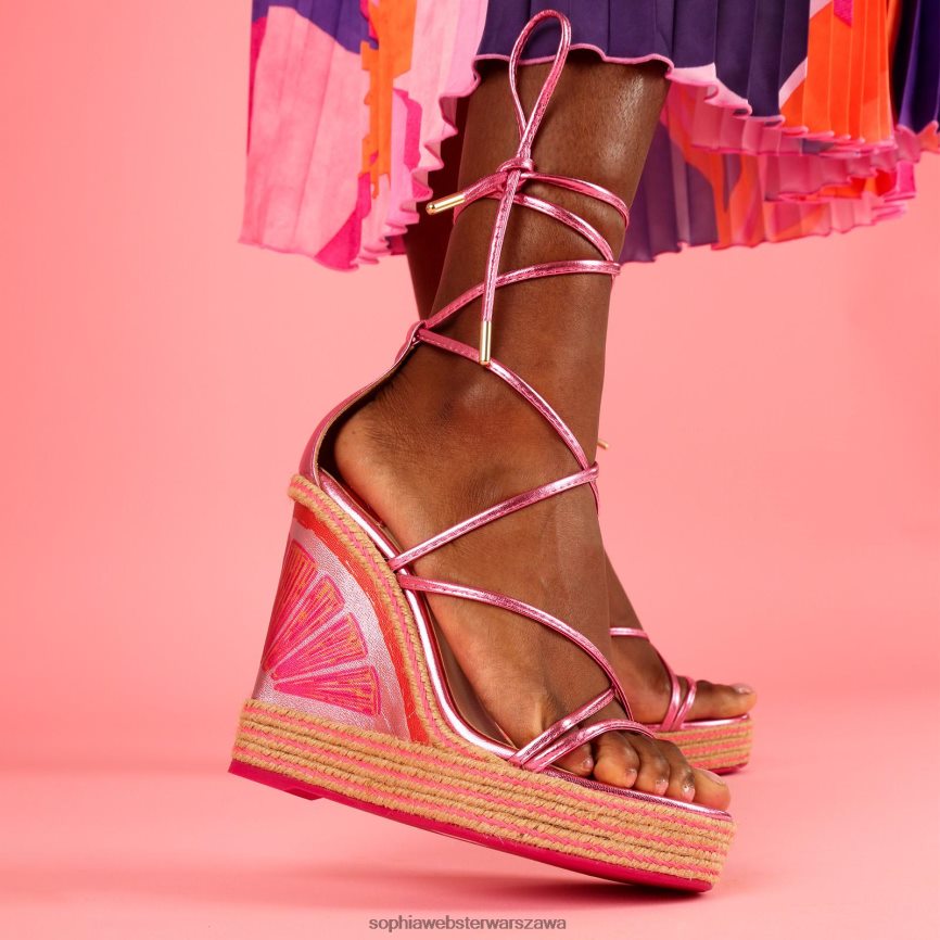przedstawiamy mimi! ten owocowy ulubieniec ma nadrukowany metaliczny klin pomelo, owinięty warkoczem z rafii z neonowymi przeszyciami i wykończony super seksowną cholewką z paskiem mignon w metalicznym różu. noś swój od plaży do baru lub podnieś swój letni wygląd, aby uzyskać najlepszy wygląd.