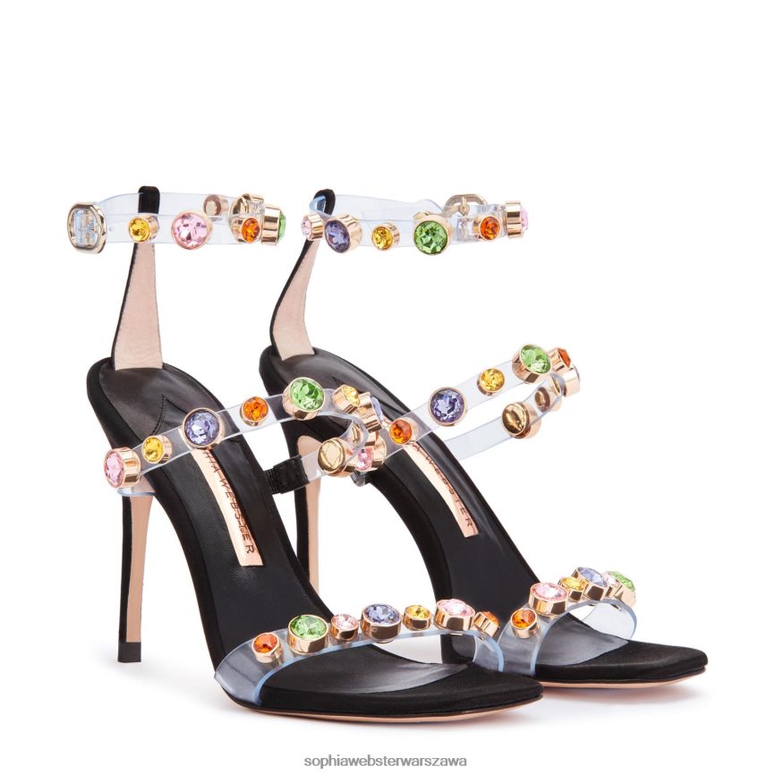 nasze najlepiej sprzedające się sandały, które prawie nie istnieją, powracają! w tym sezonie nasze sandały z klejnotami Rosalind mają naszą charakterystyczną cholewkę z wieloma paskami z przezroczystego winylu, ozdobioną tęczą szklanych klejnotów w różnych rozmiarach i odcieniach. z czarną skórzaną cholewką i kwadratowym noskiem, łatwo sparować z dowolnym zestawem, aby uzyskać efektowne wykończenie! delikatnie wykonane w Hiszpanii