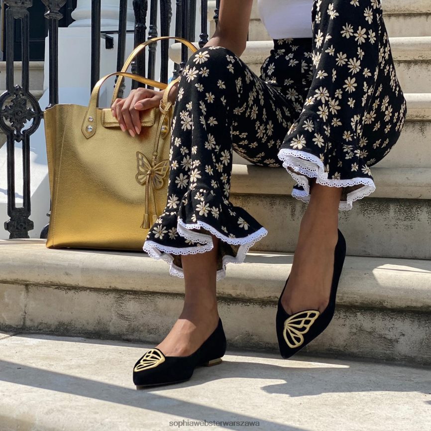 zaktualizowaliśmy klasykę i jesteśmy prawie pewni, że zakochasz się jeszcze bardziej w naszych nowych motylach! nasz zaktualizowany projekt skrzydeł motyla jest nieco mniejszy, super kobiecy i ma nieco mniejszy zasięg, szykowną i seksowną aktualizację pokazującą nieco dekolt w stopie z podwyższoną górną linią. ta płaska czółenka w kształcie motyla z czarnej skóry i złotego haftu jest wykończona wyściełaną skarpetą dla dodatkowego komfortu. zrobione w Brazylii.